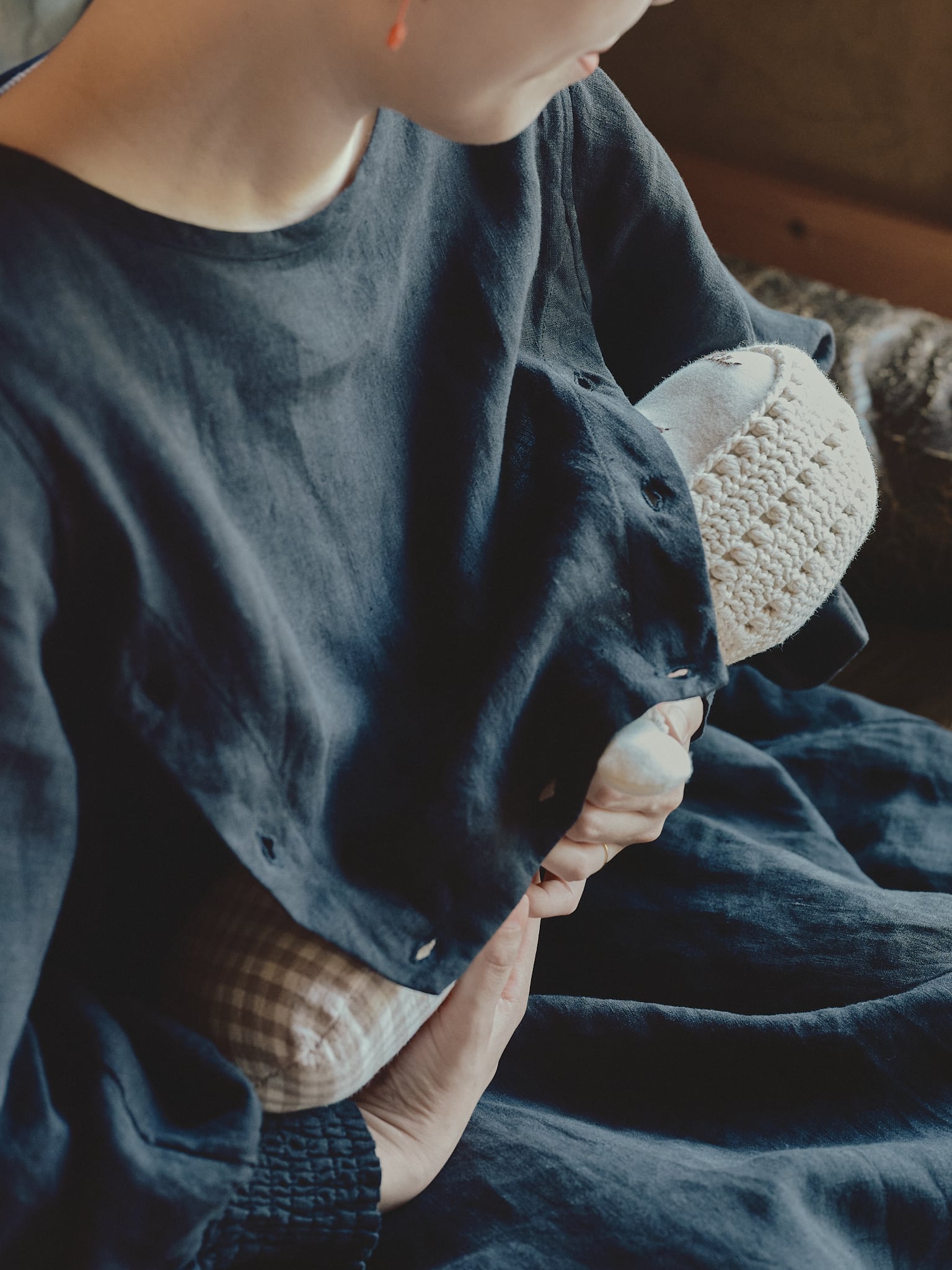 敏感肌でリネンのちくちく感が苦手なデザイナーが、赤ちゃんのやわらかいほっぺにもやさしい風合いをと、選び抜いた生地です。