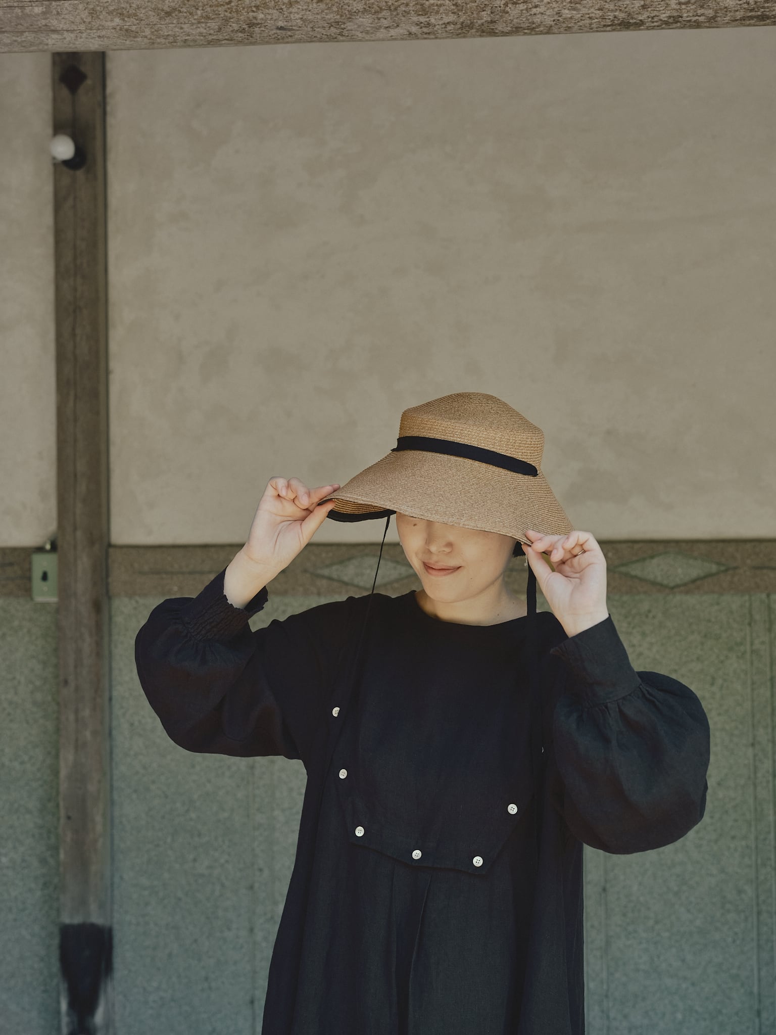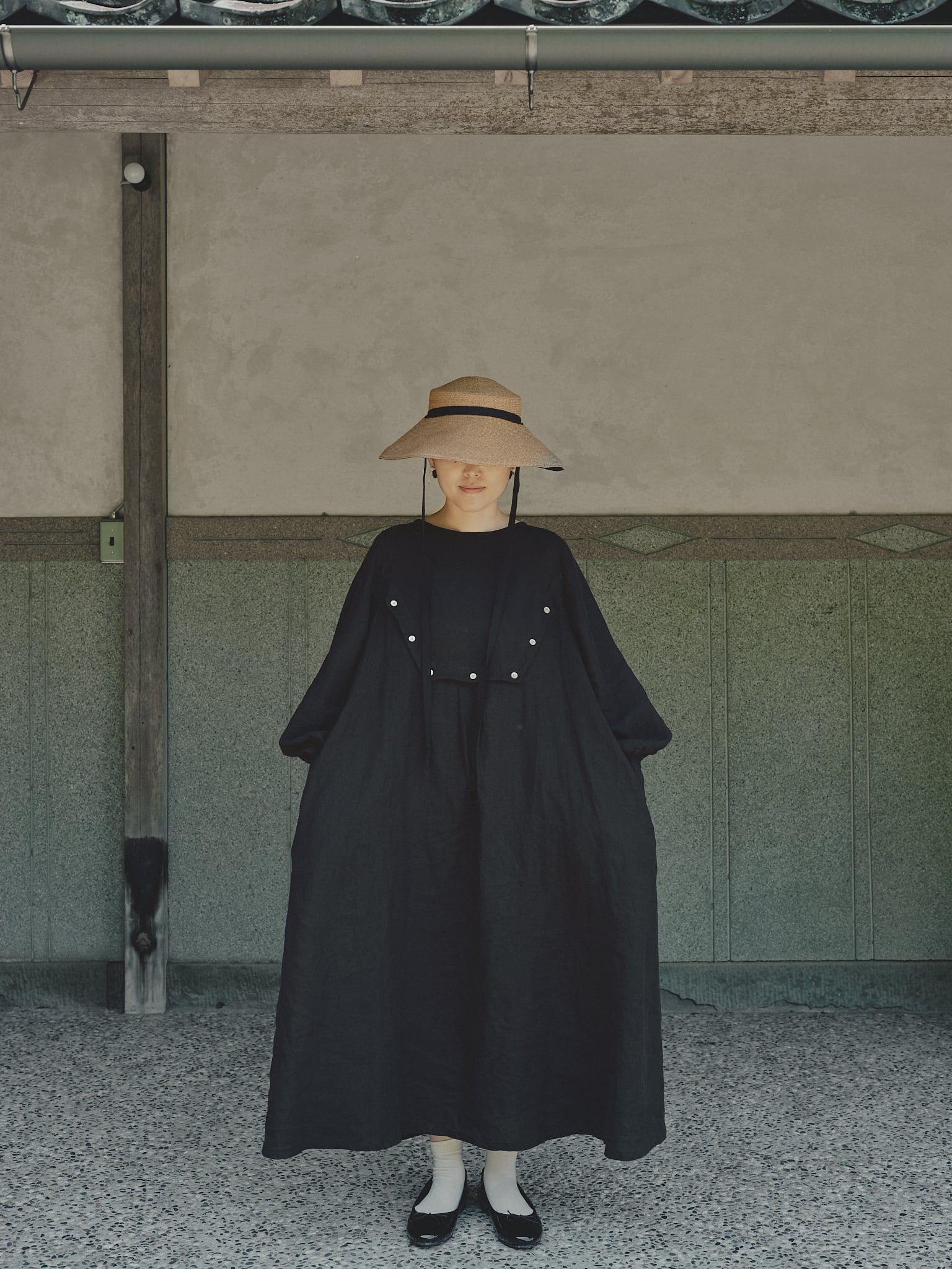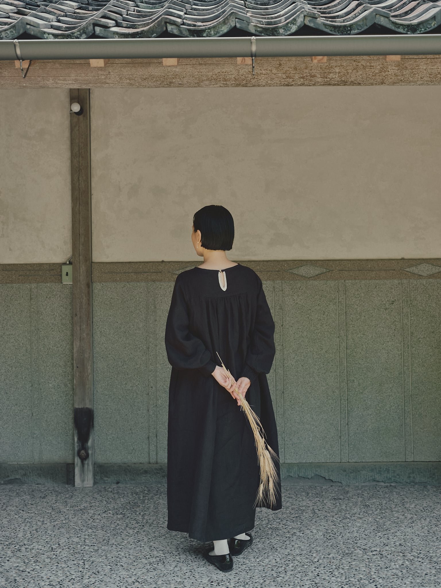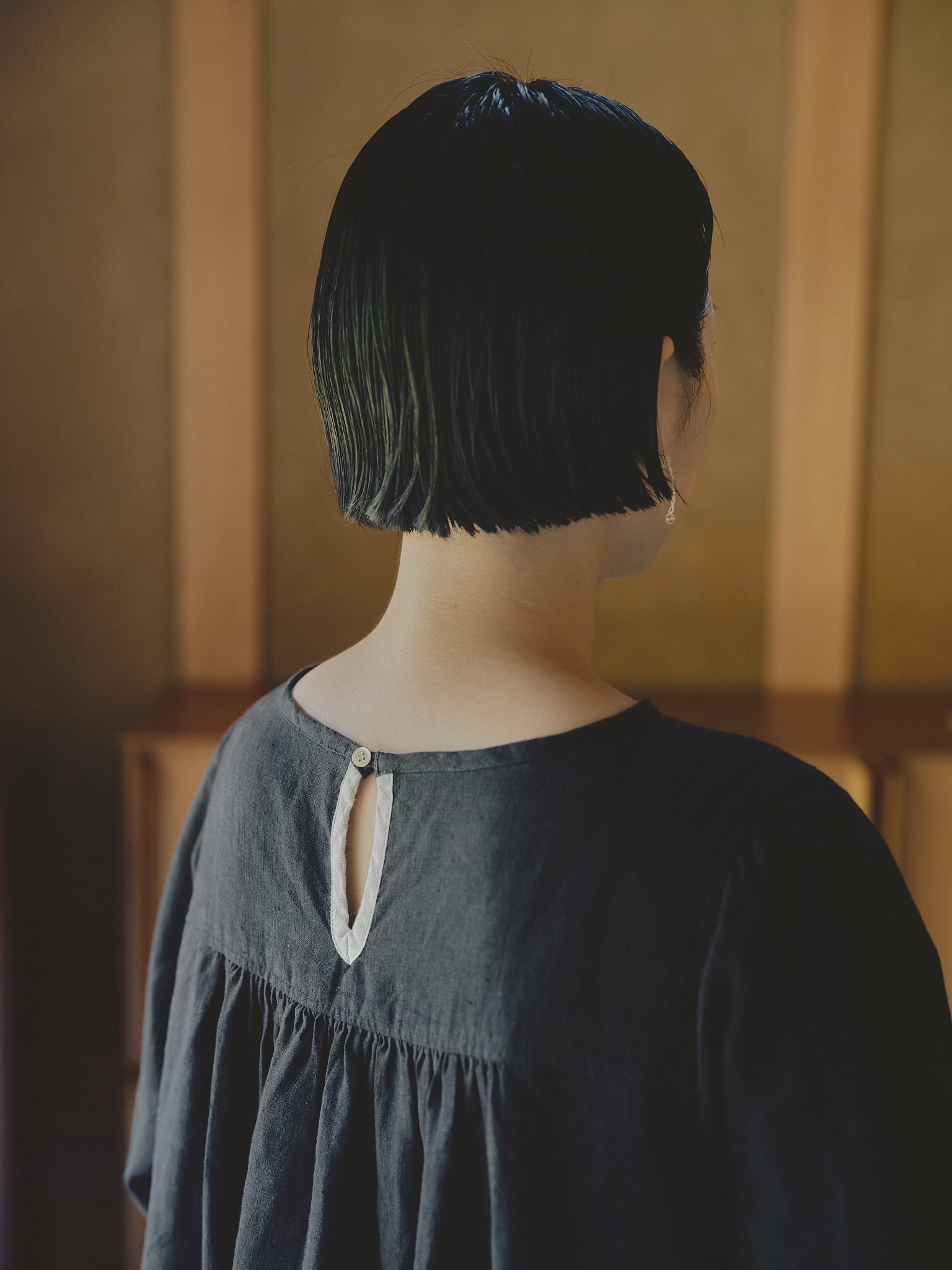 衿ぐりの後中心に同素材の麻ベージュパイピングの涙あきを施し、後ろ姿にもさりげないデザインポイントをつくりました。
