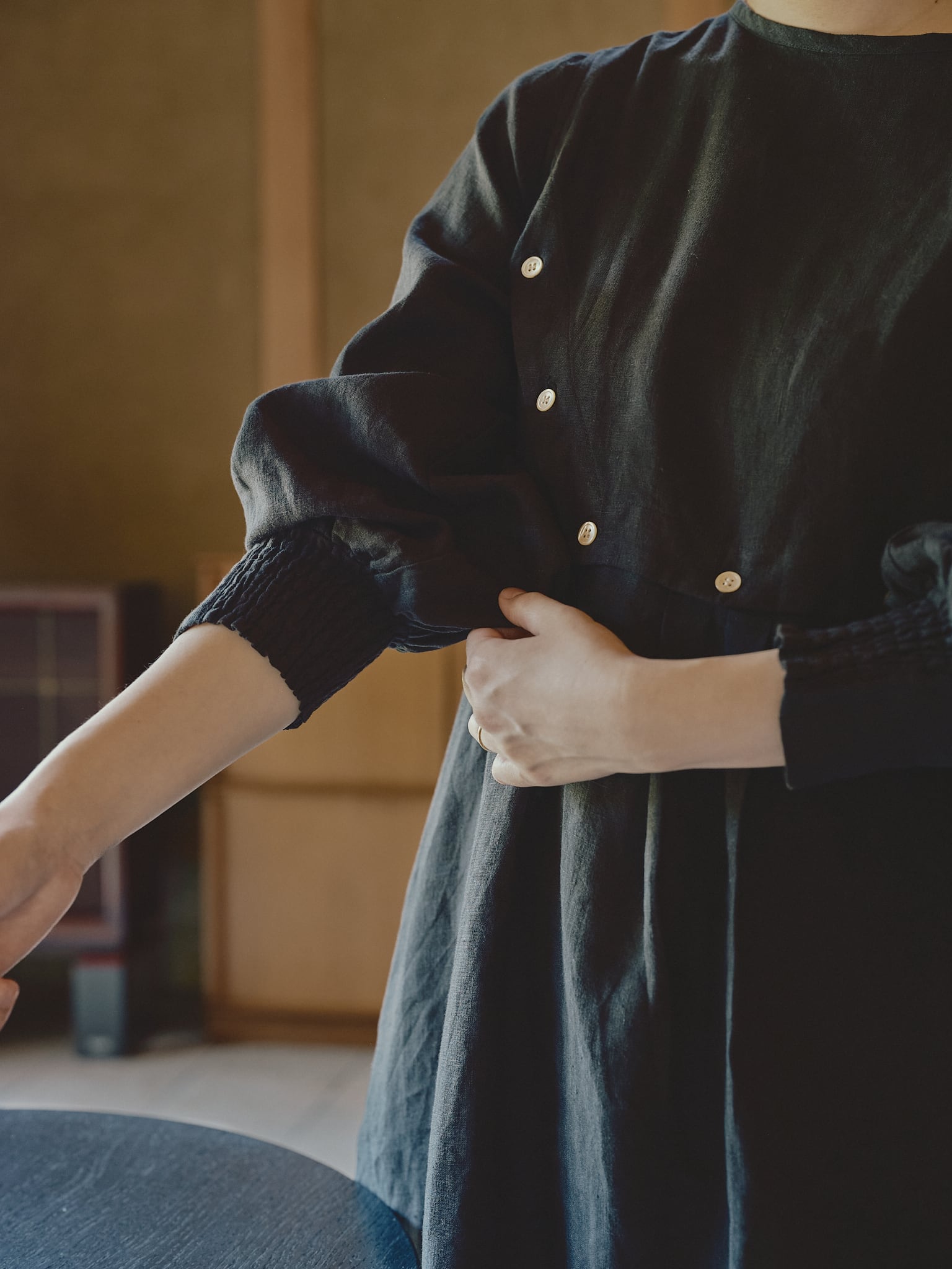 袖口は正面から見るとすっきりとしたカフスのデザインですが、切替を入れてシャーリングゴムの仕様を採用しているため、端正な雰囲気ながら、手を洗う時や赤ちゃんのお世話をする際にもさっと袖をまくり上げることができます。